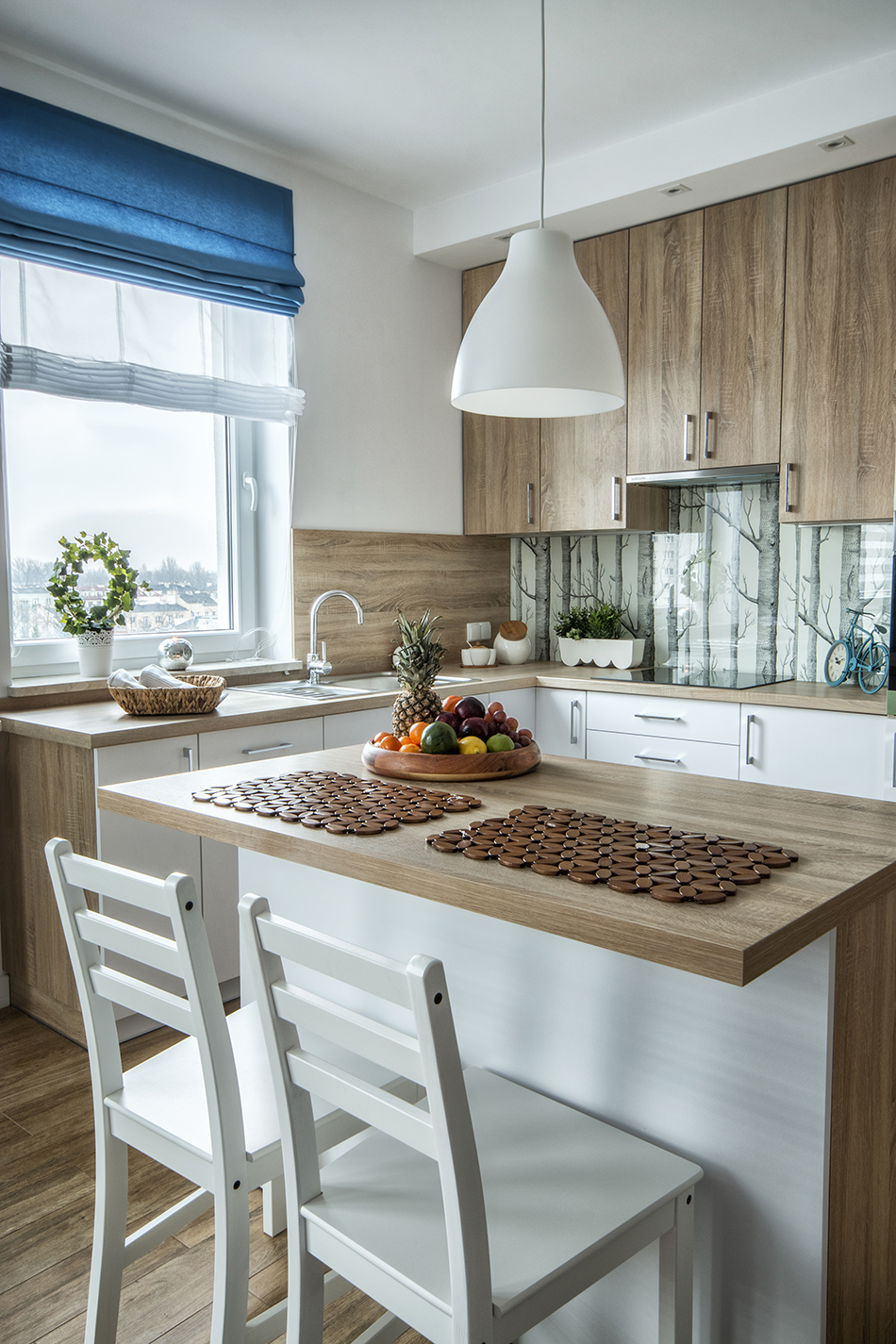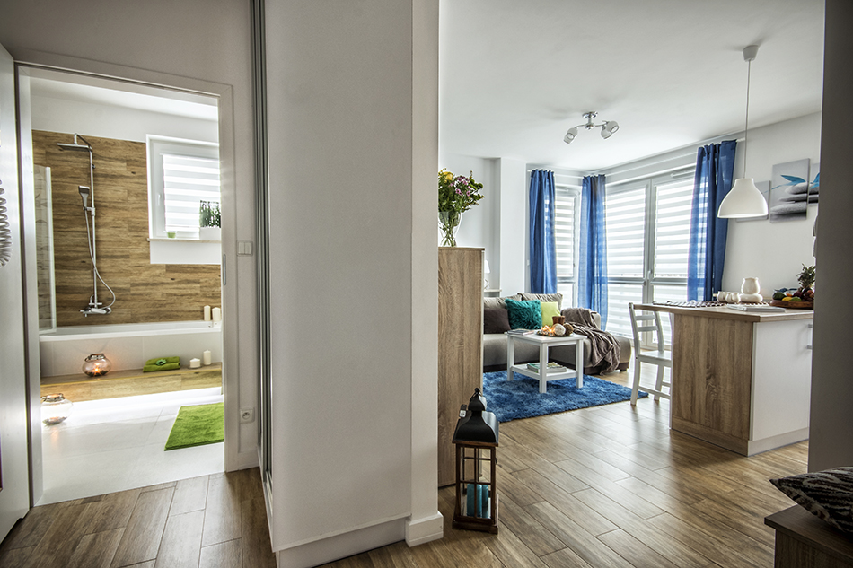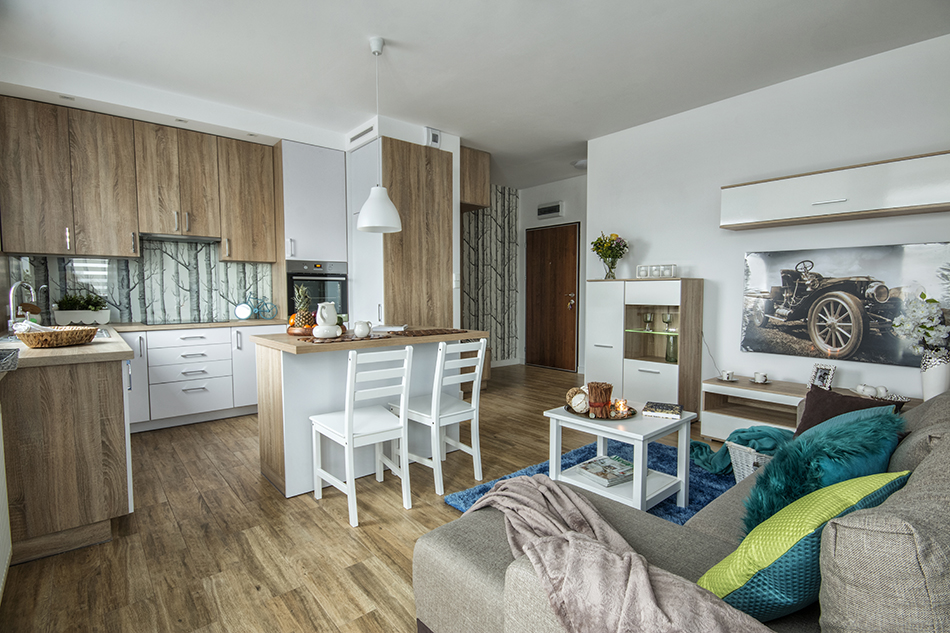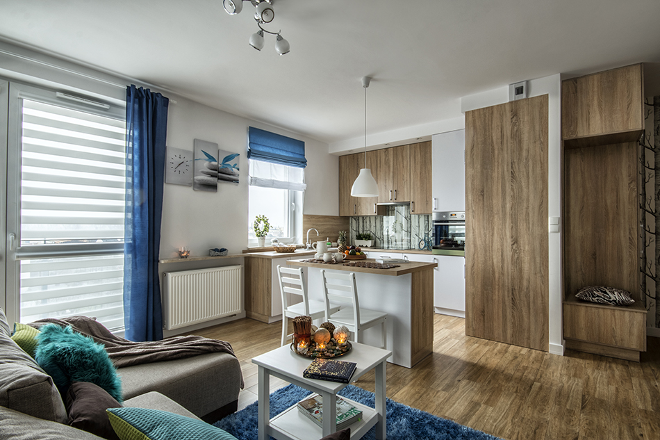 Mieszkanie, choć malutkie ma wszystko co potrzebne. Część dzienną z możliwością spania na rozkładanej wygodnej sofie, aneks kuchenny wyposażony w dużą ilość szafek, oraz obszerną wyspę, która może być zarówno stołem przy którym zjada się posiłki, ale i może być ona dodatkowym blatem roboczym.