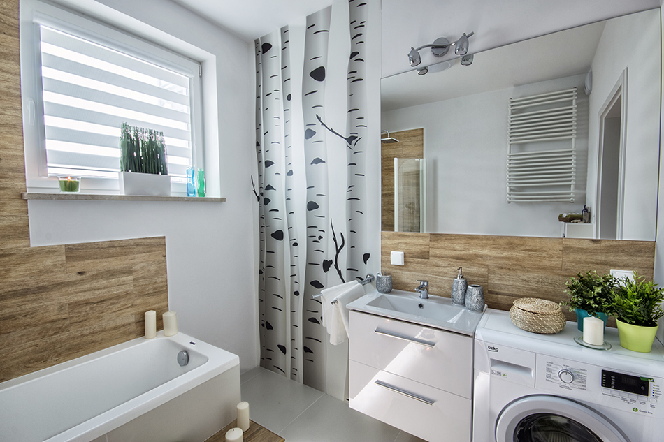 Sama łazienka jest duża, bo ma ok 5 metrów kwadratowych, a do tego jest jasna nie tylko dzięki zastosowanej kolorystyce, ale i dzięki oknu, które daje dodatkowe naturalne światło.
