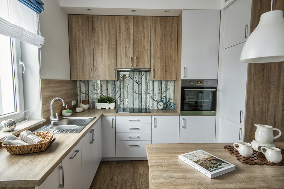 Tapeta zastosowana jest w kuchni za szybą hartowaną między szafkami, i w przedpokoju, zaraz przy wejściu.