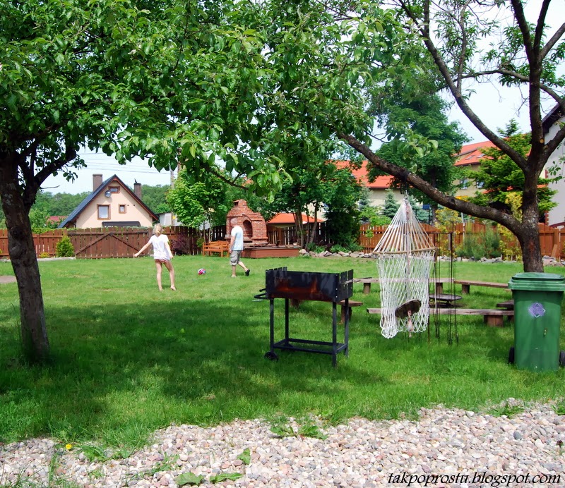 … duży plac do zabaw rodzinnych, gier, do odpoczynku – hamak między drzewkami, jest i ognisko ( były i pyszne kiełbaski, pieczony chlebek, oraz ogórki kiszone własnej roboty w dużym pękatym słoju), jest miejsce na relaks (sauna, bańka do schładzania i kącik do relaksu …)