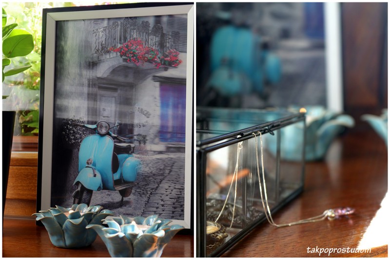 vespa  na na obrazku i świeczniki to elementy w tym pięknym kolorze.