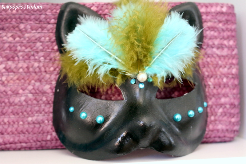 Choć cały pokój to głównie kolor biały z elementami czarnego to znalazło się miejsce na małe akcenty i w innych kolorach, trochę z sentymentu do rzeczy których szkoda było wyrzucić , a trochę dlatego ,że  wiązały się  z czymś…np. maska zrobiona przez Natalkę jako praca na technikę zainspirowała nas do wprowadzenia dodatku w tym pięknym morskim kolorze który znalazł się na piórach…