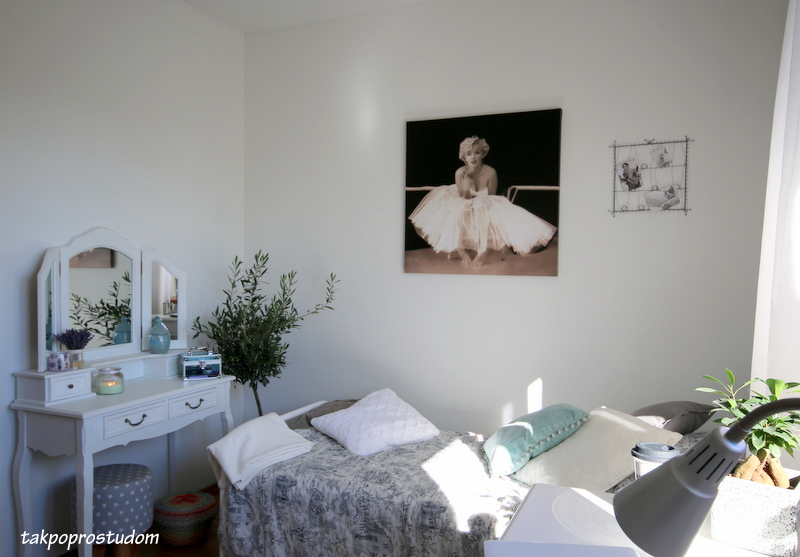 8. Pozostałe elementy takie jak narzuta na łóżko, pufa przy toaletce, która jest jeszcze do wymiany, kosz/ stolik wiklinowy przy łóżku, obrazy z Marlin Monroe, drzewko oliwne to rzeczy własne.
