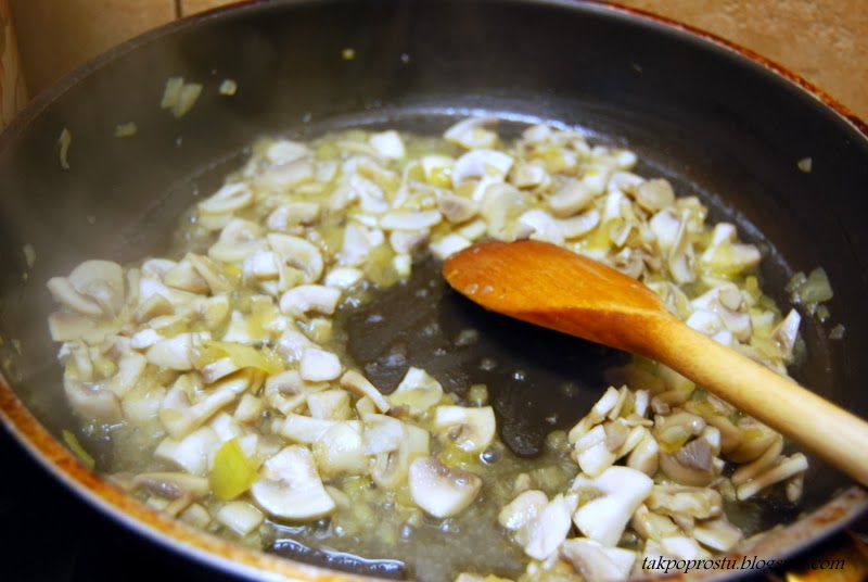Oliwę z oliwek rozgrzewamy na patelni, wrzucamy cebulę i smażymy do zeszklenia. Następnie dodajemy pieczarki, solimy i smażymy często mieszając.