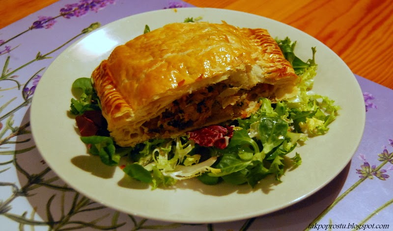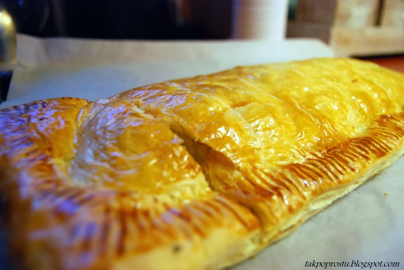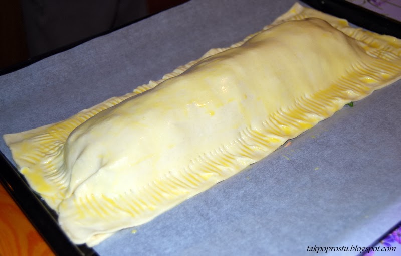 Blachę wykładamy papierem pergaminowym (do pieczenia) Ciasto francuskie (rozmrożone) kroimy wzdłuż tak, żeby jeden płat był szerszy od drugiego. Mniejszy płat ciasta kładziemy na blachę, nakłuwamy widelcem, nakładamy farsz z miski, zostawiając ok. 1,5 cm wolnego brzegu ciasta. W czystej misce mieszamy żółtko z odrobiną wody. Smarujemy brzeg ciasta jajkiem.