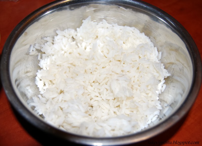 Gotujemy mniej więcej 5 minut na wolnym ogniu. Następnie wyciągamy łososia z mleka (łosoś nie jest do końca ścięty) Oddzielamy mięso od skóry, skórę wyrzucamy. Małe kawałki mięsa łososia wrzucamy do miski z ryżem. Delikatnie mieszamy, całość doprawiamy solą i pieprzem. Ponownie mieszamy.