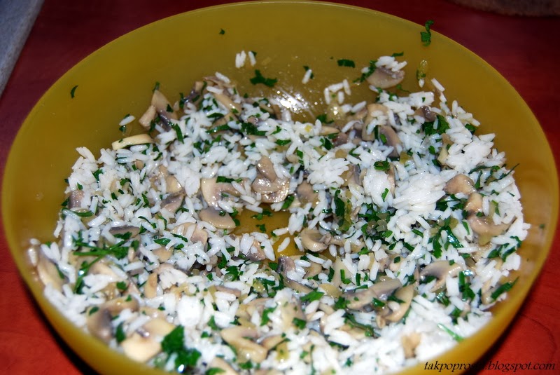 Do czystej miski wkładamy usmażoną cebulę i pieczarki, następnie ugotowany ryż. Pół pęczka natki pietruszki siekamy i dodajemy do ryżu, cebuli i pieczarek. Mieszamy.