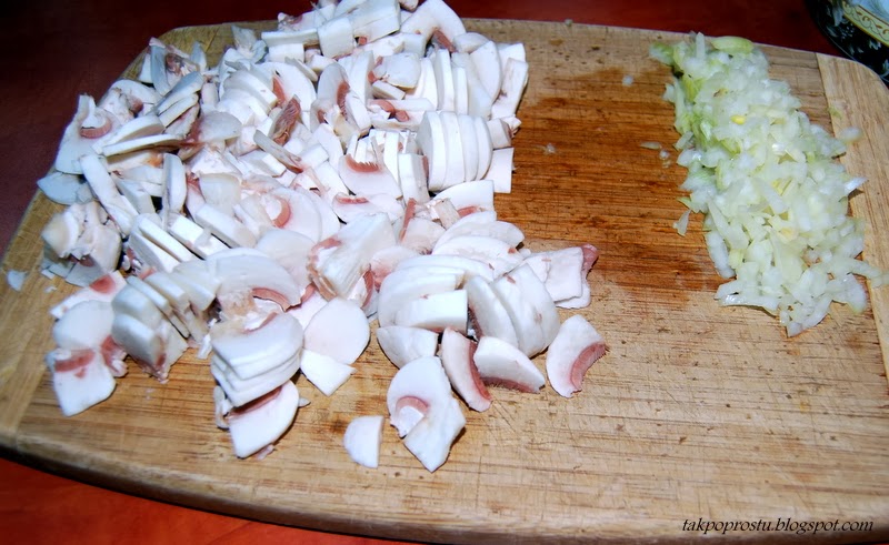 Cebulkę siekamy. Pieczarki myjemy i kroimy w półplasterki.
