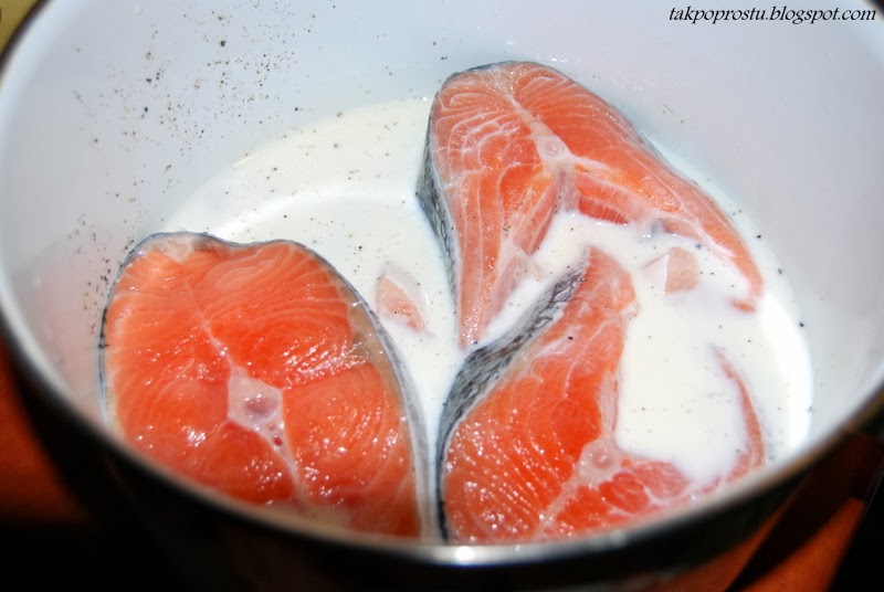 Filety z łososia myjemy i osuszamy, wlewamy 1 szklankę mleka do garnka, dodajemy pieprz i rybę.
