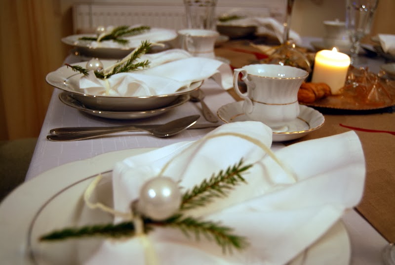 Aby było jeszcze bardziej świątecznie i elegancko, ubrałam serwety w malutkie bombeczki i gałązki świerku ściętego z mojego ogródka.